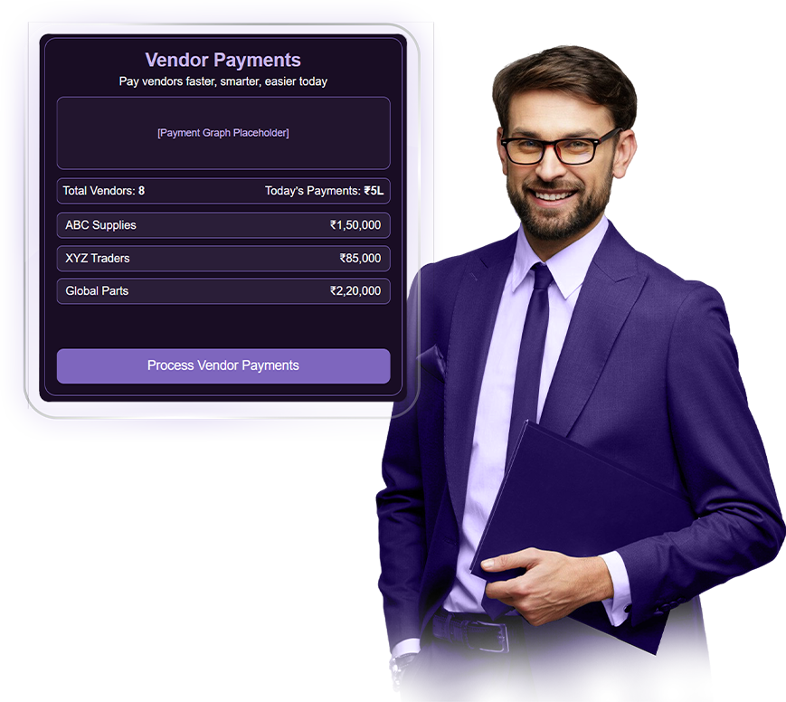 Transfer vendor payments instantly using UPI handles—no need for bank details. It’s fast, secure, and works 24x7 effortlessly.